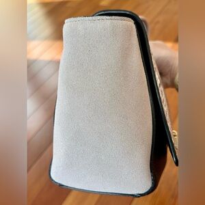 Kate Spade Magnolia Park Large Laurel satchel. Gray suede sides and black pebbled leather with snakeskin pattern over flap with gold hardware on opening.