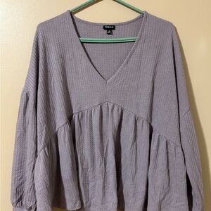 Chic gray blouse with a textured design. Features a flattering V-neck and relaxed fit. Ideal for versatile styling. Lavender in color in great condition.