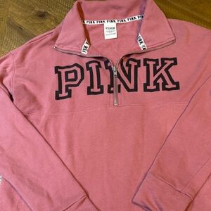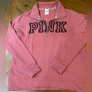 Comfy cozy quarter zip sweater in a vibrant pink. Features a bold logo design. Ideal for casual wear. Great condition, no stains, holes or issues noted!