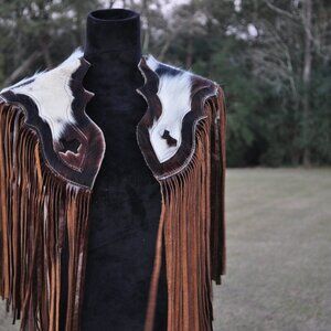 🤍🤎 Handcrafted Cowhide & Leather Fringe Bolero – One of One 🤎🤍