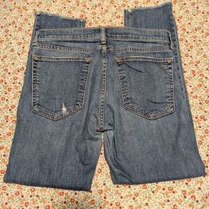 • intentional raw hem and distressing throughout (back pocket, front inner pocket and by button)