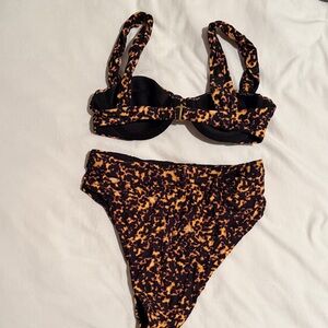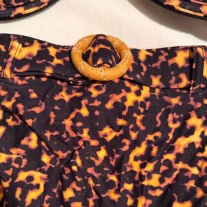 We wore what leopard print bikini set with a bold design. Features a unique pattern in black and orange. Cute little belt with high waisted bottoms
