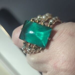 This exquisite vintage necklace features lustrous faux pearls and a striking green glass stone centerpiece, and comes with a velvet storage case. Perfect for adding a touch of elegance to any outfit.