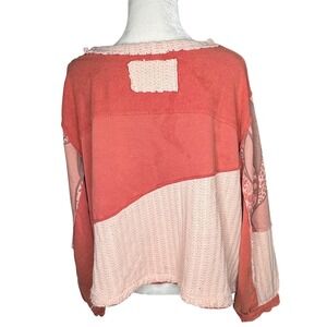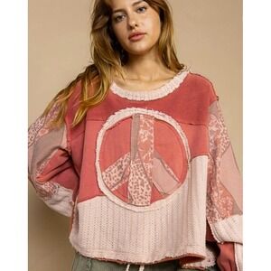 Keywords: POL, sweatshirt, patchwork, peace sign, distressed, boho, coral, pink, knit, cotton, unique, festival, casual, artistic, appliqued