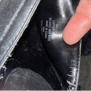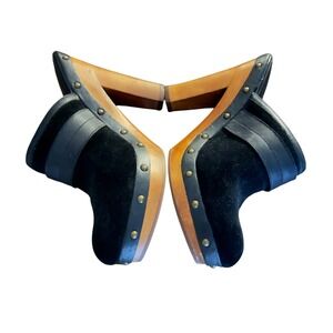 Elevate your footwear collection with these stunning Lauren Ralph Lauren clogs. Crafted from luxurious black suede and supple leather, these mules exude a sophisticated yet edgy vibe. The rich wooden block heel provides a commanding lift, while the polished brass stud detailing adds a touch of artisanal charm. The adjustable buckle strap across the vamp offers a custom fit and a hint of equestrian-inspired style. Perfect for adding a polished finish to your everyday denim or dressing up a chic skirt for a night out. These are gently preloved. There is a small amount of flaking on the inside - see photo. The exterior is not impacted.