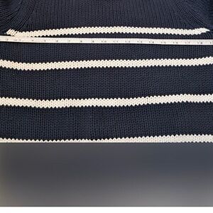 Chic navy sweater with ivory stripes. Features a cozy turtleneck design. Ideal for casual wear. Classic and adorable sweater. Quality fabric that lays perfectly for flattering fit. Rollneck; cropped fit;ribbed cuff and hem. Cotton