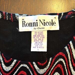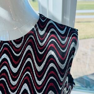 This dressy blouse is striking with sparkly black, silver and red color combination that elevates any outfit.