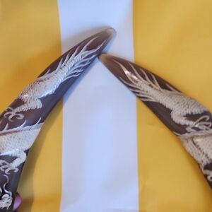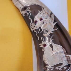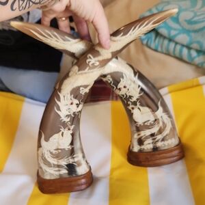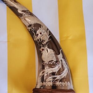 Enhance your home with these elegant decorative horn accents. The intricate design adds a touch of sophistication to any room. Perfect for those who appreciate unique home decor. Oriental craved buffalo horns with dragons and phoneix carvings and glass eyes. Collectable antique. 12.5 inches tall on wood bases.