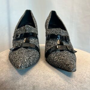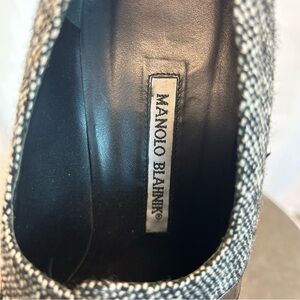 Manolo Blahnik Coupe tweed heels bootie black white patent leather buckle 41