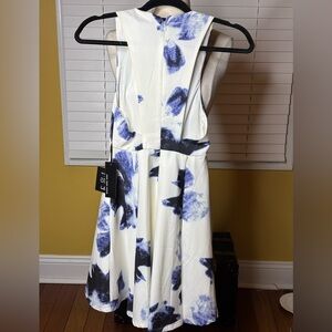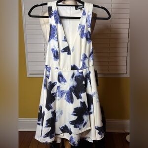 Chic mini dress with a navy floral design. Features a deep V-neck and sleeveless cut. Back is cut narrowly around a hidden zipper. Flirty, full skirt. Ideal for either dressy or casual outings. NWT