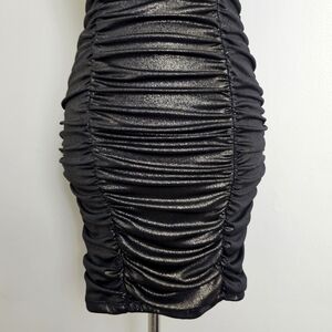 Forever 21 Y2K shiny ruched strapless bodycon dress. Black with gold metallic shimmer allover. Sweetheart neckline with twist knot detail. Built in padding. Only worn a couple times. Excellent condition! Size Medium