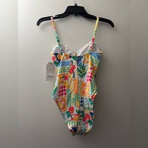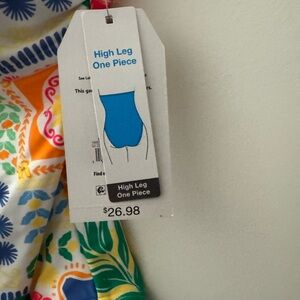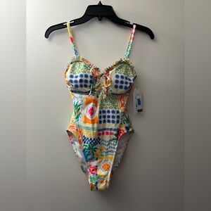 Vibrant one-piece with floral and geometric patterns. Adjustable straps for comfort. Ideal for beach or pool. Women’s XS 0-2. New with tags and protective liner.