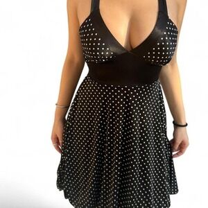 Black halter-style dress with a deep V neckline, fitted waist band, and flouncy polka dot skirt.