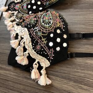 Beautiful good condition pre-owned Black Multicolor Paisley Embroidered Tassel Push Up Festival Dance Bra Size 32B. Removable push up pads, adjustable straps. This is made for festival season! Who’s gearing up for Coachella and Stagecoach?
