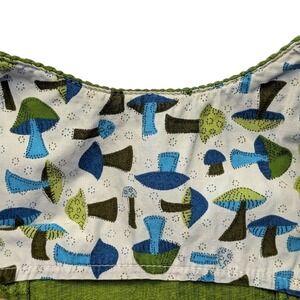 A vintage Gymboree girl's green corduroy pinafore dress in size 12-18 months in good pre-owned condition. Features a front pocket with an embroidered mouse peeking out and the words "hide n seek" embroidered below. The dress has a playful mushroom print lining. Zipper closure at the back. Has normal wash wear from use but no other stains or holes. Does not include the bloomers. Made from 100% cotton.