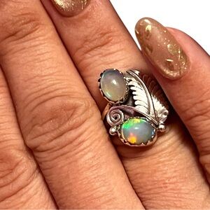 Stunning sterling silver ring featuring genuine Ethiopian opal stones and a leaf design. Perfect for adding a touch of sophistication to any outfit. Very unique design.