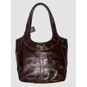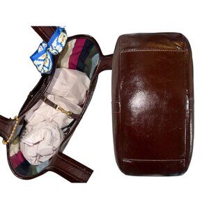 A timeless addition to your collection, this Coach Ergo Tote combines polished brown patent leather with brass hardware. It offers a chic accessory to any outfit.
