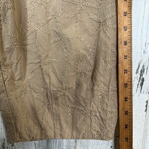 House of Harlow women’s large embroidered trouser pants in beige/tan with palm print. Flowy boho resort chic aesthetic. Perfect for vacation, casual luxury, or statement summer style.