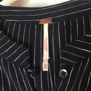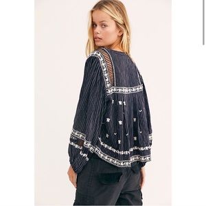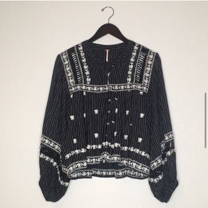 Beautiful blue top with white stitching embroidered. Oversized sleeves with peek-a-boo slots on the top and sleeves. Free People details never disappoint! Measurements: 21.75”-22” long. No stretch.