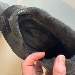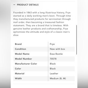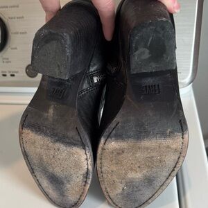 Good condition size 7.5 M Frye Essa bootie. Some scuffing and signs of wear at toe and on heel. Not noticeable due to dark color. Heel is 3” Zippers in excellent working condition and inner sole area in good condition. Plenty of life left! Could be polished up easily! Classic closet staple that never goes out of style!