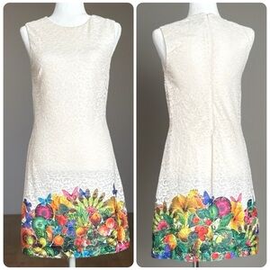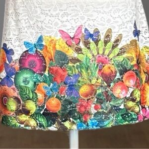 Desigual dress, Desigual floral dress, Desigual fruit dress, Desigual butterfly dress, Desigual garden print dress, Desigual lace dress, lace sheath dress, floral border dress, fruit border dress, garden print sheath, sleeveless lace dress, white lace dress, colorful floral dress, summer dress, vacation dress, resort wear dress, spring wedding guest dress, European fashion dress, made in Romania dress, Desigual size 40, Desigual US 8, embroidered look print dress, botanical print dress, bright floral dress, festival dress, statement print dress, cottagecore dress, whimsical dress, vibrant print dress, knee length dress, sheath silhouette dress, lined dress, retro inspired dress, art print dress