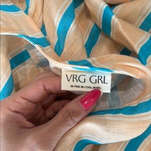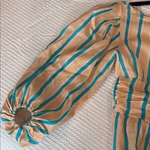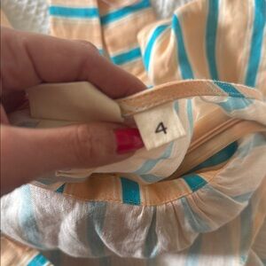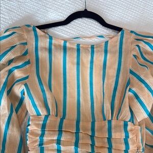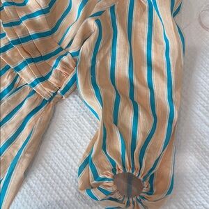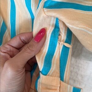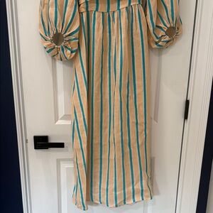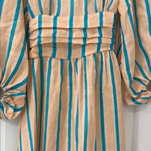 This dress boasts a square neckline and elegant bishop-style 3/4 sleeves, ideal for casual resort wear. The dress features a harmonious blend of peach and blue stripes, offering a chic and relaxed look. Its lightweight fabric and defined waistline ensure comfort and style for warm weather outings.
