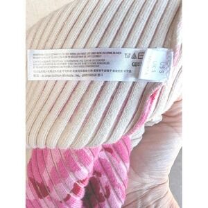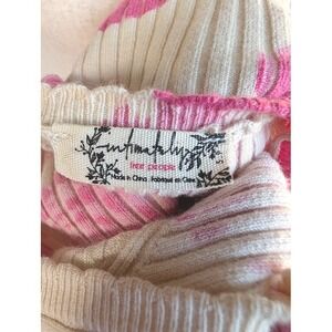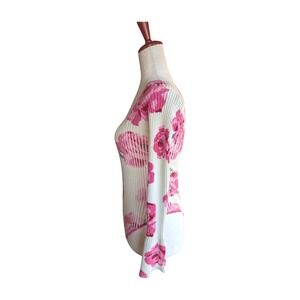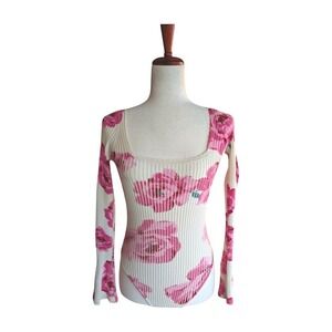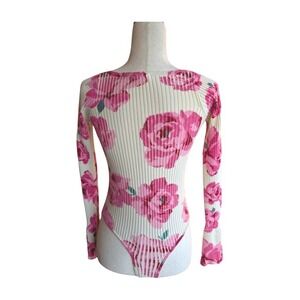 Intimately Free People Lover to Lover ribbed bodysuit featuring a bold pink floral print on a cream base. This long sleeve piece boasts a flattering square neckline and a high-cut leg for a sleek silhouette. Perfect for layering under denim or styling with skirts for a chic, put-together look.