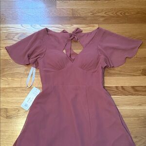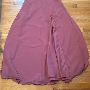 Chic mauve maxi dress with flutter sleeves. Features a stylish slit for added elegance.
