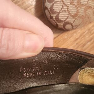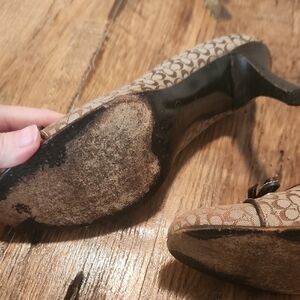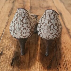 Stylish Coach heels with a signature pattern. Features a chic bow detail. Perfect for any occasion.