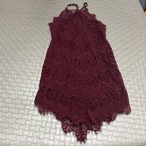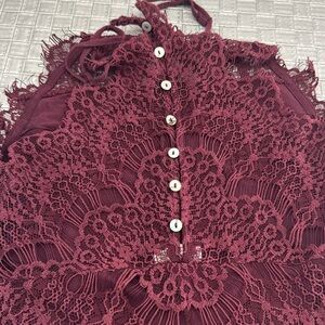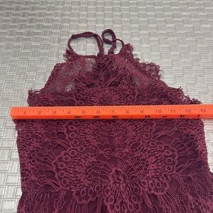 Fairycore, Sexy, spring break, spring, boho, romantic, festival, vacation, honeymoon Free People burgundy lace mini dress, size XS, sleeveless halter neckline, scalloped hem, sheer lace overlay, bodycon fit, stretch lining, elegant cocktail dress, romantic lace texture, ideal for weddings, date nights, formal events, or party looks, soft feminine silhouette, rich wine red tone, flirty and flattering,perfect addition to your boho chic wardrobe, Y2K inspired glam, romantic core, party core, feminine core