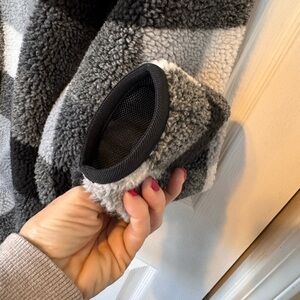 Smoke pet free home, no rips, stains or odors, Nike black, white and gray Sherpa long sleeve pullover, soft textured fleece, mesh lining, quarter zip neckline, P/P 23, Length 26, Sleeve 25