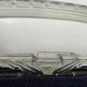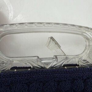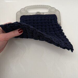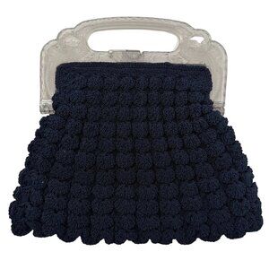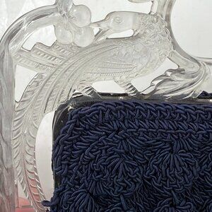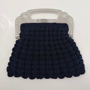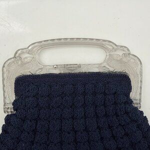 VINTAGE 30s Popcorn Crochet Navy Blue Peacock Handle Evening Bag