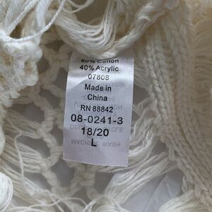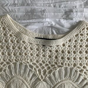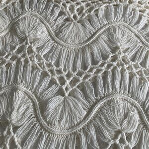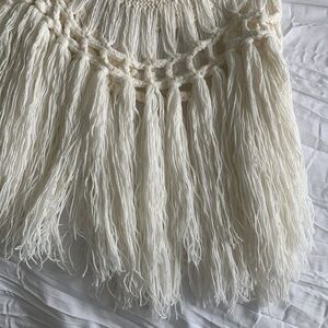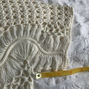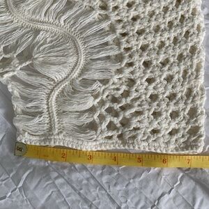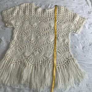This boho inspired sweater is beautiful! Delicate and detailed crochet pattern throughout and finished at the hem with fringe! The neutral off white/cream color makes it a versatile piece for your wardrobe! Wear in any season depending on what you choose to layer it with!