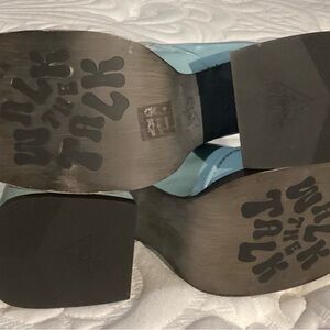 Elegant light blue Mary Jane platforms with a glossy finish. Features a bold buckle and chunky heel. With its decorative piping, leather buckle, and chunky heel. 1” platform. Reviews say they run 1/2 size large.