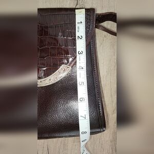 Vintage Brighton brown crossbody bag in great condition with a minor stain as seen in photo. The leather is well conditioned. It is a thick leather, and there are no flakes or cracks in it. The leather strap is adjustable and has no flakes or cracks. The interior is spotless and has a pocket with a zipper in excellent working condition. The front of the bag has a metal embellishment and has a discolored spot on the inside, not visible from the outside. The back of the bag has a compartment and scratch as seen in photo. Measurements provided in photos.