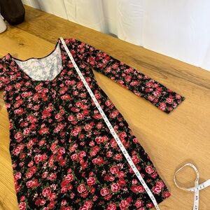 Beautiful Forever 21 floral bodycon dress in size Large. Features a black base with an allover red rose print, long sleeves, and a stunning deep scoop back. Soft, stretchy fabric creates a flattering, fitted silhouette perfect for date nights, parties, or holiday events.