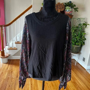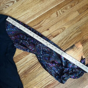 Anthropologie long sleeve top, size Large. Dark blue with silk paisley sleeves that have an accent tie at the end. In good used condition.