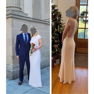 I wore this to my civil ceremony. I did not include the original tag size, as it was altered for my shape. I am a size 0, 24 waist, 34B chest, 5’1 height. Comment with any questions you have.