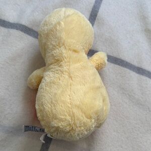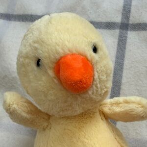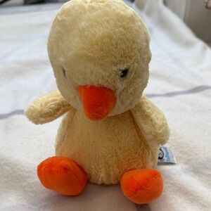 This "gentle hatchling" duck features soft, primrose-yellow fur with bright orange feet and a matching bill.