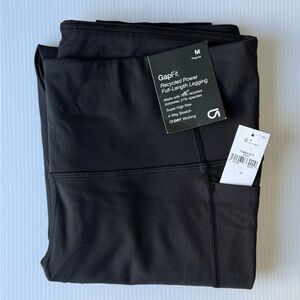 This is a pair of GapFit Recycled Power Full-Length Leggings in size M Regular. They are super high rise, made with 79% recycled polyester and 21% spandex, and feature 4-way stretch and DRY Wicking technology.