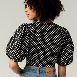Free People Polka Dot Puff Sleeve Crop Top Blouse Womens Size 2 Black White