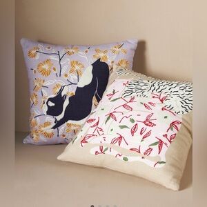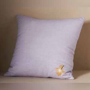Add a touch of whimsy to your home with this charming throw pillow featuring a playful dog design. The pillow showcases a delightful combination of black, white, and gold colors, perfect for any decor. Anthropologie Connell French Bulldog Embroidered Pillow. The decorative throw pillow features a black and white French Bulldog design with white and gold embroidered flowers on a lilac, 100% cotton background