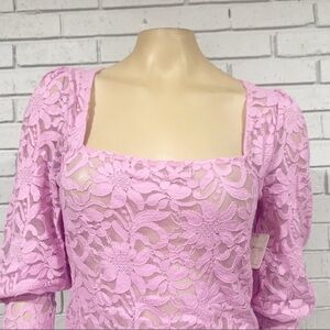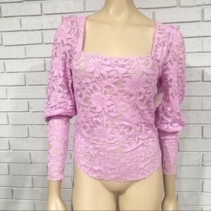 A sheer lace fabric with shirted shoulder detail make for a standout top that can be dressed up or dressed down.