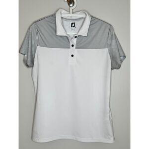 This bundle includes two FootJoy women’s golf polo shirts designed for performance, comfort, and a clean athletic look. Both tops feature a classic polo silhouette with short sleeves and stretch performance fabric that’s breathable and lightweight, ideal for golf, tennis, pickleball, or everyday athleisure wear. One shirt features a black and white micro-dot pattern with a crisp colorblock design, while the second features a white base with vibrant pink and sporty stripe detailing for a fresh, modern look. Both shirts are size Medium and measure approximately 19 inches pit to pit and 23 inches in length. Fabric is a smooth athletic blend made for movement and moisture control. Condition is overall excellent, with only slight discoloration under the arms on the black and white shirt as shown in photos. No holes or structural flaws. A versatile, stylish bundle perfect for activewear rotation or golf wardrobe essentials.
