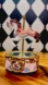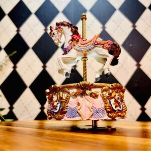 A vintage musical carousel, beautifully detailed with a prancing white horse adorned in pastel garlands, golden trim, and sculpted ribbons. When wound, the carousel gently rotates as it plays music—be sure to listen to the video with your volume on to experience its charming melody and graceful movement.