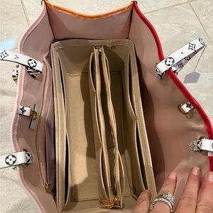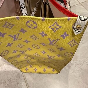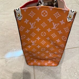 The handbag in the image is a Louis Vuitton OnTheGo GM tote in the limited edition "By The Pool" or "Escale" collection, featuring a Giant Monogram coated canvas in various shades of pink and cream/white. It features both short top handles and longer shoulder straps with a reverse monogram print, offering versatile carrying options.