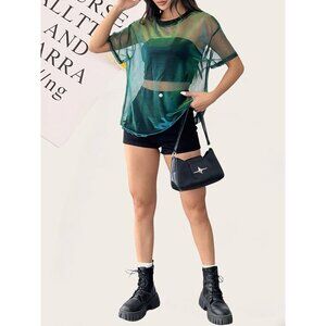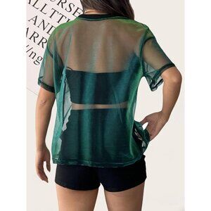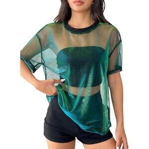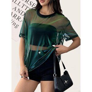 Women's Metallic Mesh Sheer Short Sleeve Rave T-Shirt Small Green Stylish