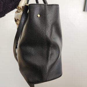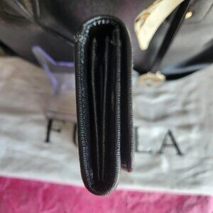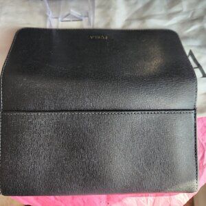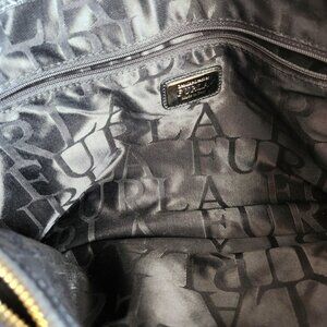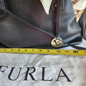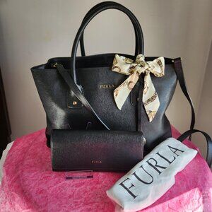 Furla Black Saffiano Leather 5 pc tote set EUC. You get the bag, wallet, Furla charm, Furla dust bag and decorative scarf. The size is an approximation at 13.5 x 9 inches height. I have also add pictures as well. Everyone needs a luxury bag in your closet. This bag has dual handles, shoulder strap, goldtone hardware, middle zipper compartment, FURLA is embossed on the inside of the bag, Furla hang tag, separate compartments and feet on the bottom to protect the bag. The bag and wallet have no callouts that I could see, that is why i took pictures. Pictures of the wallet enclosed. While I have listed the price, I am open to reasonable offers. All sales are final, no cancellations and no returns. I appreciate your visiting my closet, I hope you have an amazing shopping day.