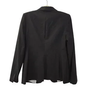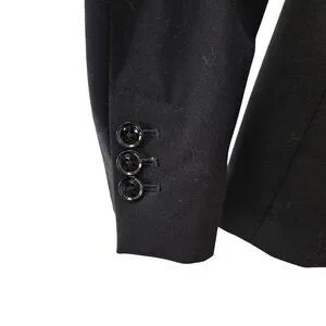 Really nice, classic black wool blazer jacket that is fully lined. Two button closure and three button detail at the wrists. Pair with a skirt or trouser pants for work or jeans for a more casual vibe. Venting slit on the back that is still sewn shut.