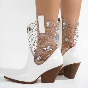 Cape Robbin Chriena Cowboy Boots Women, Rhinestone Cowgirl Boots for Women, Glittery Stylish Western Outfit for Women - White Size 5.5
